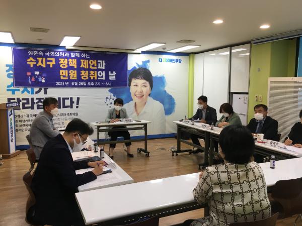 더불어민주당 정춘숙 의원(경기 용인시병·재선)은 6월 26일 경기도 용인시 수지구 사무실에서 ‘수지구 정책제언과 민원청취의 날’을 개최했다.