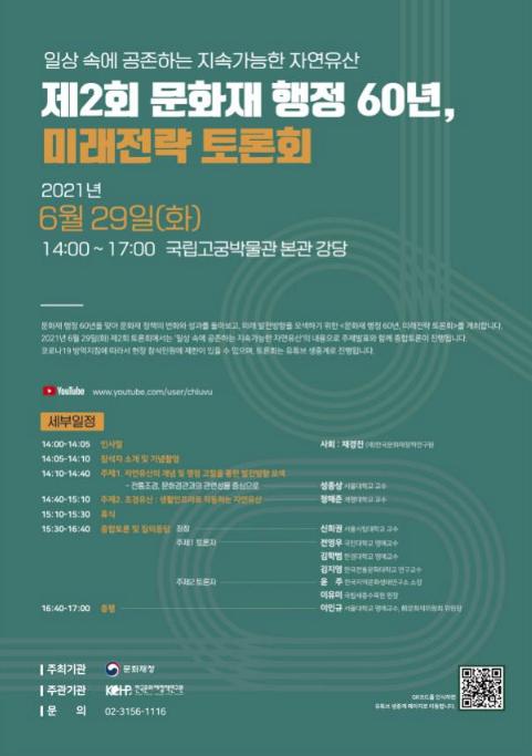 문화재청이 문화재 행정 60주년을 맞아 기획한 제2회 ‘문화재 행정 60년 미래전략 토론회’가 29일 오후 2시 국립고궁박물관에서 열린다.