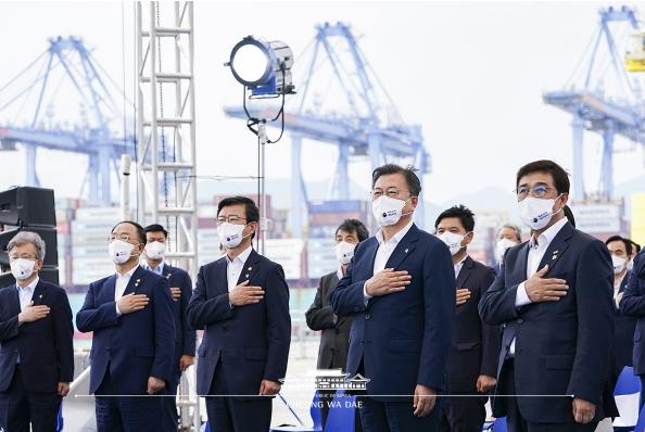 문재인 대통령은 오늘 오후 국내 수출입 화물의 관문이자 글로벌 허브 항만인 부산 신항 다목적부두에서 열린 '해운산업 리더국가 실현전략 선포 및 1.6만TEU(컨테이너의 단위, 1TEU는 20피트 컨테이너 1대를 말함)급 한울호 출항식'에 참석했다. 이 자리에서 문 대통령은 우리 정부의 국정과제인 해운재건의 성과를 점검하고, 해운산업 리더국가로의 도약을 위한 전략을 함께 논의했다.