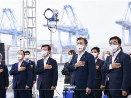 문 대통령은 "'해운업 재건'에 시동을 건 지 3년, 한국해양진흥공사 설립과 HMM이 신규발주한 초대형 컨테이너선 20척을 계기로 우리 해운업이 기적같이 살아났다"며 "지난해 첫 출항한 세계 최대 컨테이너선 '알헤시라스 호'를 시작으로 만선이 계속되고 있으며 해운 강국의 자존심을 다시 찾았다"고 밝혔다.