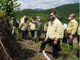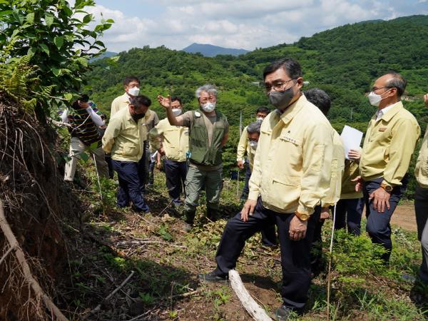 최병암 산림청장은 여름철 집중호우 및 태풍으로부터 땅밀림 피해를 최소화하기 위해 7월 16일 경상남도 하동군 땅밀림 우려 지역을 방문하여 안전조치 사항을 점검하였다.
