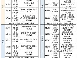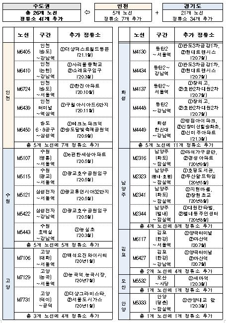 (오산·김포시 등) M5532(오산~사당)는 세마역(1호선), M6117(김포~서울역)은 마산역(김포골드), M6450(송도6·8공구~삼성역)은 테크노파크역(인천1호선) 등에 각각 정류소 추가 설치