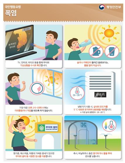 행정안전부는 폭염 장기화에 대비 7월 20일 오전 10시를 기해 폭염 위기경보 수준을 ‘주의’단계에서 ‘경계’단계로 상향 조정하였다.