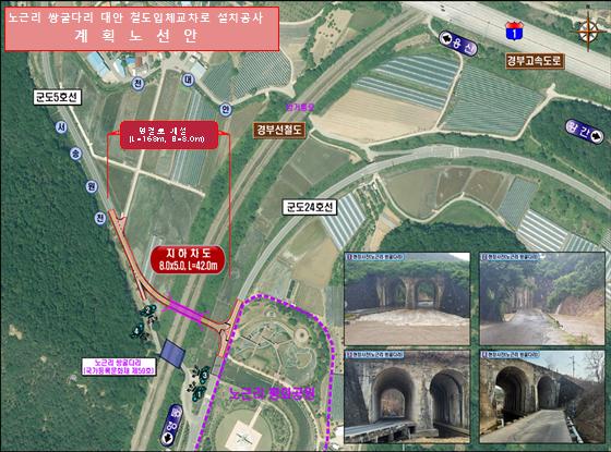 1930년 설치된 노근리 ‘쌍굴다리’는 위로는 경부선 철도가, 아래로는 1차선 도로와 하천이 지나가며 경부고속도로와 연결된 군도가 지나간다.