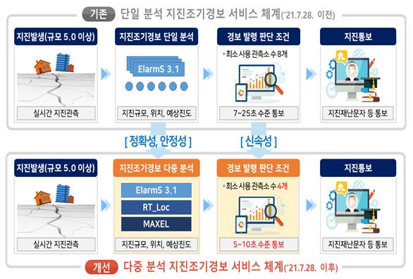 기상청은 7월 28일부터 새로운 다중 분석 기법을 적용하여, 지진 관측 후 기존 7~25초에서 선진국 수준인 5~10초로 지진조기경보 발표시간을 단축시킨다.