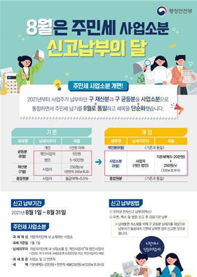 이에 따라 종전 7월에 주민세 재산분을 납부했던 사업주들은 8월 1일부터 8월 31일까지 납기가 변경되었으며, 종전 재산분 외에 균등분(개인사업자·법인)도 함께 주민세 사업소분으로 신고·납부해야 한다.