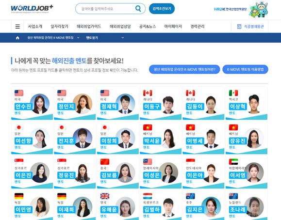 ‘해외취업 K-MOVE 멘토단’은 해외취업 경험이 있는 선배들이 해외 진출을 희망하는 청년들에게 생생한 노하우를 제공하기 위해 2013년에 시작된 프로그램으로, 코로나19로 인해 2020년부터 월드잡플러스에서 온라인으로 멘토링을 제공하고 있다.