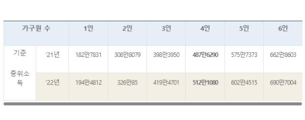 2022년도 기준 중위소득은 4인 가구 기준으로 올해 487만 6290원 대비 5.02% 인상된 512만 1080원으로 결정되었다.