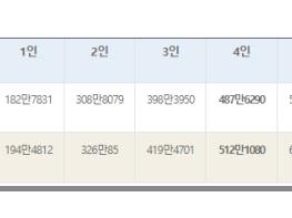 4인 가구를 기준으로 급여별 선정기준은 생계급여 153만 6324원, 의료급여 204만 8432원, 주거급여 235만 5697원, 교육급여 256만 540원 이하이다.