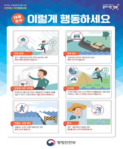 특히, 도심내 침수나 범람 우려가 있는 지하차도, 둔치주차장, 하천변 산책로 등에 대해서는 선제적으로 차량과 주민을 통제하도록 하고, 백신접종센터, 임시선별검사소 등 코로나19 가설 시설물의 천막·그늘막에 대한 안전조치를 강화하도록 하였다.