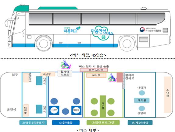 마음 안심버스는 국가·권역별 트라우마센터에서 5개 권역별(수도권‧충청권‧강원권‧호남권‧영남권)로 총 5대를 운영하며, 방역 현장 대응인력에게 휴식공간과 심리지원 서비스를 제공한다.