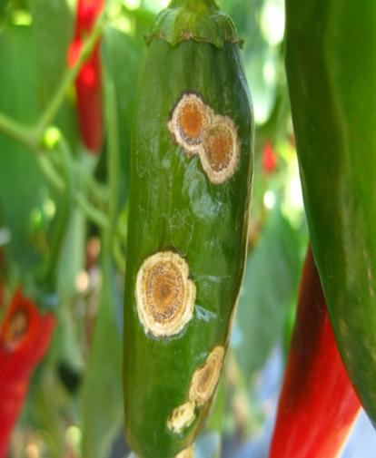 고추에 나타나는 탄저병의 첫 증상은 초기에 열매에 오목하게 들어간 어두운 초록색 점이 생긴다. 이후 점차 둥근 겹무늬가 커지면서 주황색 점들이 나타나고 검게 썩어 들어간다.