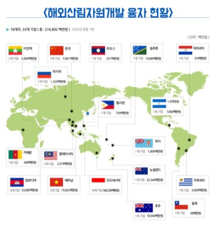 올해 해외산림자원개발사업에 대한 융자 예산은 35억 원을 추가로 확보하여 총 82억 원으로 상반기에는 무림피앤피, 이건사업, 우림에너지, 산림조합중앙회 4개 업체에 46억 원을 융자해 인도네시아, 솔로몬제도, 베트남에서 해외조림사업을 추진 중이다.