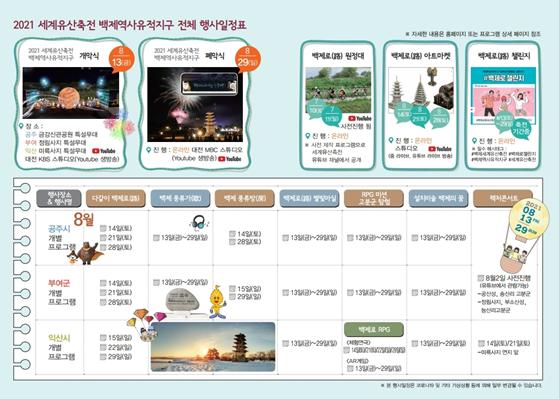 문화재청, 충청남도, 전라북도, 공주시, 부여군, 익산시가 주최하고 한국문화재재단(이사장 최영창), 백제세계유산센터, 충남문화재단, 익산문화관광재단이 공동 주관하는 「2021년 세계유산축전 백제역사유적지구 - ’찬란한 유산, AGAIN(어게인) 백제로!」가 13일부터 29일까지 17일간 행사를 진행한다.
