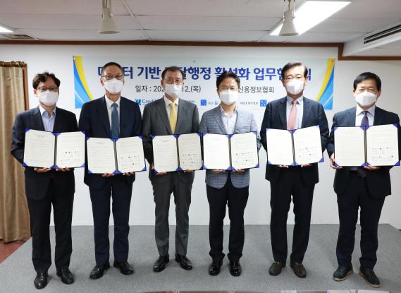 조달청과 이크레더블, 한국기업데이터, NICE디앤비, NICE평가정보, SCI평가정보 등 5개 신용조회사는 12일 신용정보협회에서 데이터 기반 조달행정 활성화를 위한 업무협약을 체결했다.