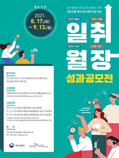 국토교통부는 국토교통 분야 중소·벤처기업을 대상으로 8월 13일부터「일.취.월.장.」공모전을 개최한다고 밝혔다.