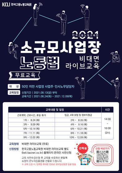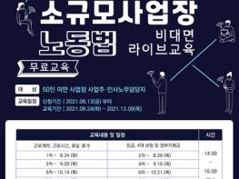 이번 교육은 50인 미만 소규모사업장 내 사업주와 인사·노무 담당자 대상으로 8~12월 총 10회(월 2회) 비대면 실시간교육으로 진행된다.