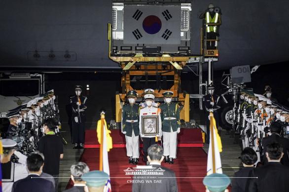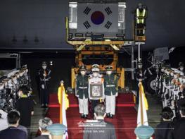특별수송기가 우리 영공에 진입할 때에는 공군 전투기 6대가 조국으로 귀환하는 장군을 호위했다.