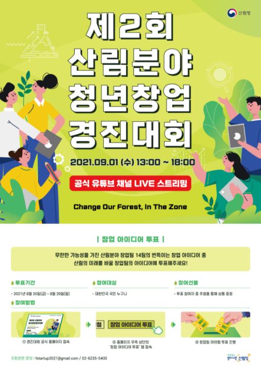 산림청은 ‘제2회 산림분야 청년창업경진대회’의 온라인 대국민 투표를 8월 20일부터 8월 29일 자정까지 10일간 경진대회 누리집에서 진행한다.