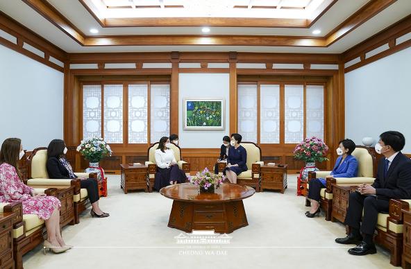 특히 접견실 복도에 전시된 발달장애 작가 최차원 님의 작품 ‘바다거북과 산호’에 관심을 가진 루이스 여사에게 김 여사는 바다 속 생명의 조화로움을 그린 작품의 의미와 작가에 대한 소개를 하며 양국의 문화 교류와 협력에 대한 대화도 나누었다.