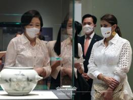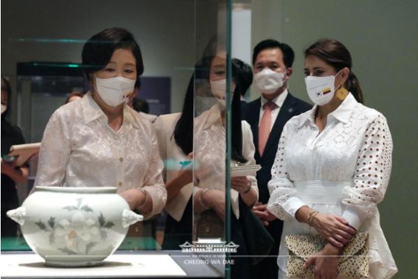 문재인 대통령의 부인 김정숙 여사는 26일 오후 국빈방한 중인 콜롬비아 대통령 부인 마리아 훌리아나 루이스 여사와 국립중앙박물관을 방문해 전시된 유물을 관람했다.