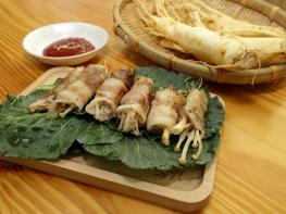 대패 삼겹살을 이용해도 좋다. 고기 위에 감자 칼(필러)로 얇게 썬 인삼과 팽이버섯을 올린 뒤 돌돌 말아 프라이팬에 굽는다. 이때 삼겹살이 풀리지 않게 하려면 고기 이음새 부분을 먼저 익혀준다.