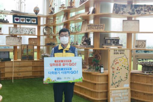 국립자연휴양림관리소는 한 번 쓰고 버려지는 일회용품 사용을 줄이기 위한 ‘친환경 캠핑문화 일회용품 줄이GO! 성숙한 휴양문화 다회용기 사용하GO!’ 슬로건을 정하고, 산림휴양문화를 즐기러 오는 휴양림 및 캠핑장 이용객에게 안내하고 있다.