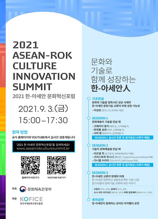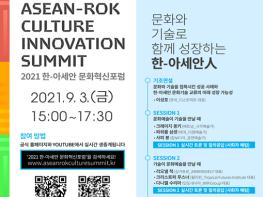 문화체육관광부는 한국국제문화교류진흥원과 함께 9월 3일 오후 3시, ‘2021 한-아세안 문화혁신 포럼’을 온라인으로 개최한다. 이번 토론회는 누구나 볼 수 있도록 공식 누리집, 한국국제문화교류진흥원 유튜브 채널을 통해 생중계한다.