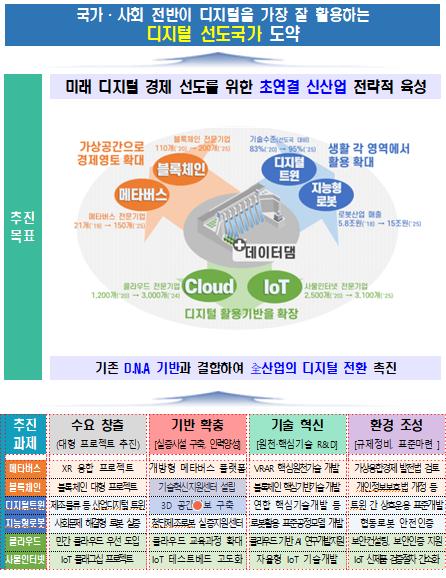 정부는 ‘초연결 신산업 육성’을 위해 메타버스·블록체인 등 핵심 유망분야에 ’25년까지 약 2.6조원 규모의 예산을 집중 투자하고, 각 영역별 특성에 맞는 맞춤형 정책지원으로, ➊신규 시장수요 창출과, ➋산업 기반 확충, ➌선도국과의 격차 해소를 위한 기술혁신, ➍新산업 확산을 위한 법제도 정비 등 환경 조성에 주력할 계획이다.