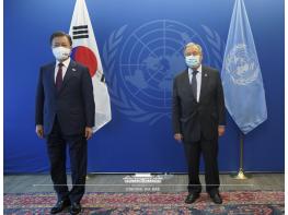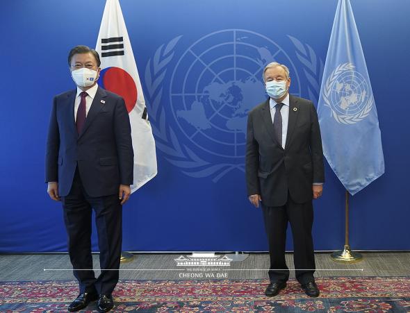문 대통령은 구테레쉬 사무총장에게 “연임을 축하하며, 사무총장 임기 중에 한국 대통령으로 최초로 5년 연속 유엔 총회에 참석한 것을 기억해 주면 좋겠다”고 말했다.