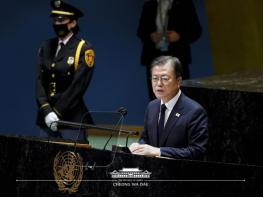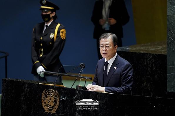 문재인 대통령은 21일 오후(현지시각) 유엔 총회장에서 제76차 유엔 총회 고위급회기 기조연설을 했다. 문 대통령은 우리나라 대통령 중 유일하게 유엔 총회에 다섯 번 모두 참석하였고 기조연설을 통해 국제사회에 한반도 평화와 한국의 선도적 역할, 포용적 회복에 대한 비전과 실천을 강조해왔다.