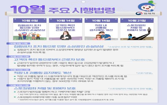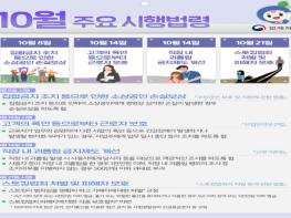 법제처는 10월에 총 125개의 법령이 새로 시행된다고 밝혔다. 주요 시행법령의 내용과 시행일은 다음과 같다.