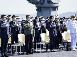 이어, 국방부 장관, 재향군인회장과 해병대 1기이자 6·25 참전용사인 이봉식 옹, 미라클 작전에 참여했던 조주영 공군 중령, 청해부대 후송 치료를 맡았던 허윤영 육군 대위 등과 함께 국군의 날 기념 케이크를 커팅했다.