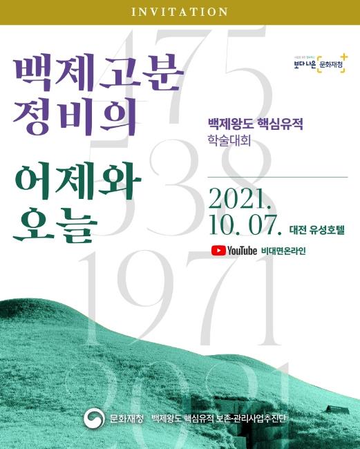 문화재청은 10월 7일 오전 10시 30분 대전 유성호텔에서 ‘백제고분 정비의 어제와 오늘’을 주제로 학술대회를 개최하고, 문화재청과 문화유산채널 유튜브에서 온라인 생중계한다.