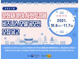 문화재청은 문화재 분야의 사회적경제 활성화를 위해 우수한 창업 종목과 혁신적인 공공비즈니스 유형을 발굴·공유하고자 ‘2021년 문화재 분야 사회적경제 비즈니스모델 공모전’을 10월 6일부터 11월 7일까지 시행한다.