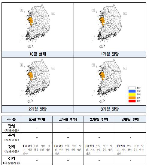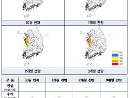 10월은 추수기인 만큼 농업용수 수요가 감소하여 농업용수 가뭄 우려는 적을 전망이나,강수량과 저수율 변화를 확인하는 등 가뭄 피해를 사전에 방지할 수 있도록 철저히 대비할 계획이다.