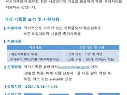 행정안전부 국가기록원은 개인이나 민간·공공기관에서 소장한 기록물 중 역사적으로 가치가 있는 기록물을 대상으로 ‘무료 맞춤형 복원·복제 서비스’를 지원한다고 10월 13일 밝혔다.