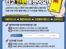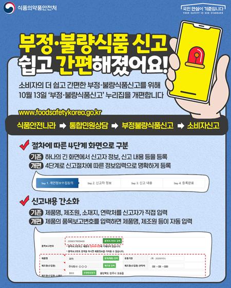식품의약품안전처는 국민이 보다 쉽고 편리하게 부정‧불량식품을 신고할 수 있도록 개편한 식품안전나라 누리집의 ‘부정‧불량식품 소비자신고’ 서비스를 10월 13일부터 시작한다.
