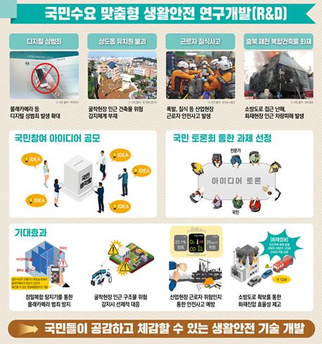 행정안전부는 국민들로부터 생활 속에서 느끼는 재난안전 사고 위험요소나 불안 요인을 해결할 수 있는 아이디어와 주제를 공모하여 연구개발을 지원하는 “국민수요 맞춤형 생활안전 연구개발” 사업을 2019년부터 추진해 오고 있다.