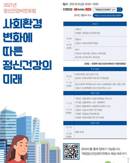 국립정신건강센터는 국회미래연구원과 함께 10월 15일 오전 10시 “사회환경변화에 따른 정신건강의 미래”를 주제로 「2021 정신건강비전포럼」을 온라인으로 개최했다.