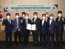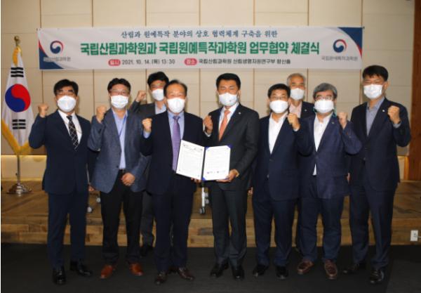 산림청 국립산림과학원은 농촌진흥청 국립원예특작과학원과 산림과 원예·특작 분야 연구 교류를 위해 10월 14일, 국립산림과학원 산림생명자원연구부(수원)에서 업무협약(MOU)을 체결했다고 밝혔다.