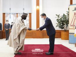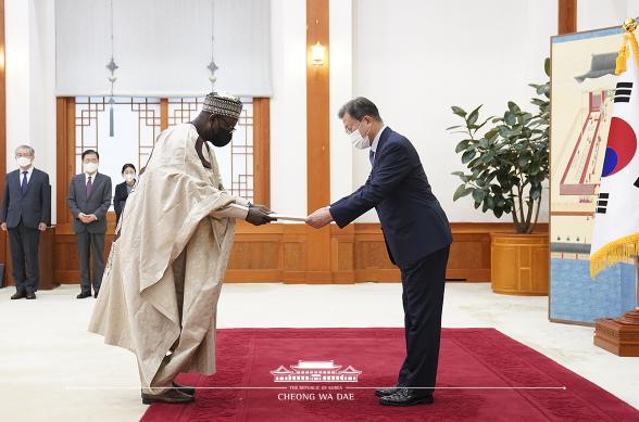 문재인 대통령은 15일 오후 3시 청와대 본관에서 나이지리아, 사우디아라비아, 가나, 필리핀, 에스토니아, 스웨덴, 엘살바도르 등 7개국 주한 대사들로부터 파견국 국가원수의 신임장을 제정받았다.