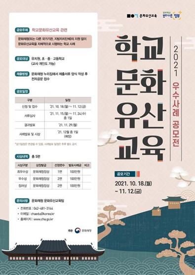 문화재청은 유치원, 초중고 일선 학교 교원들의 문화유산교육 활성화를 위해 교원들을 대상으로 ‘2021년 학교문화유산교육 우수사례 공모’를 10월 18일부터 11월 12일까지 진행한다.