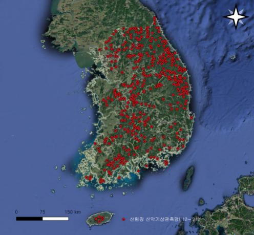 이에 따라 산림청에서는 지형이 복잡한 우리나라 산악지역의 기상상황을 보다 정밀 관측하여 서비스하기 위해 전국 주요 산악지역에 기상관측망 413개소(’21.10. 기준)를 운영하고 있으며, 이를 기반으로 산악기상정보시스템을 운영하고 있다.