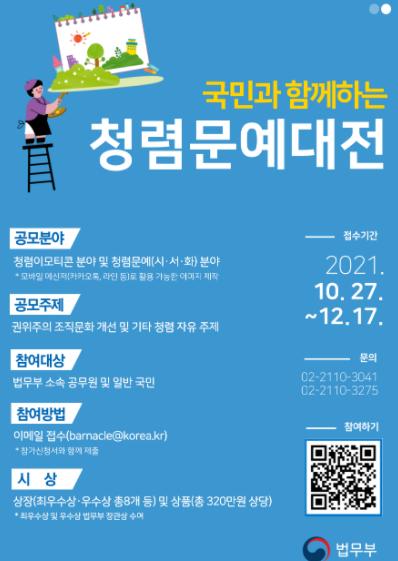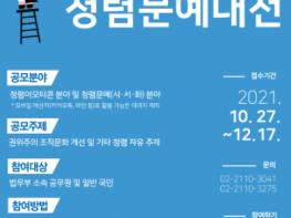 '2021년 청렴문예대전’은 법무부 소속 공무원 뿐만 아니라 일반 국민 누구나 참여할 수 있으며 12월 17일 24시에 마감한다.