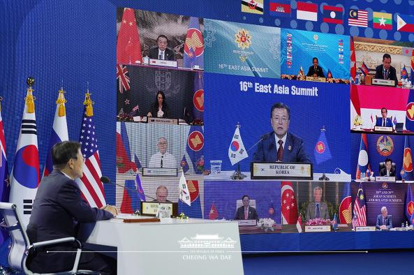 문재인 대통령은 27일 저녁 화상으로 개최된 ‘제16차 동아시아정상회의(EAS, East Asia Summit)’에 참석했다.