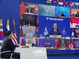문 대통령은 의제 발언에서 “세계 인구의 54%, 세계 GDP의 62%를 차지하는 동아시아의 결속은 코로나 극복과 기후위기에 대응하는 국제사회의 연대와 협력에 크게 기여할 것이며, 위기를 기회로 반전시키기 위해 EAS가 더욱 단단하게 함께하기를 바란다”고 말했다.