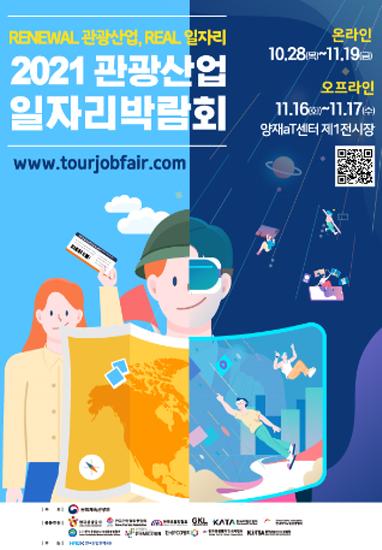 문화체육관광부는 한국관광공사와 한국호텔업협회, 한국관광협회중앙회 등 11개 관계 기관 등과 함께 10월 28일부터 11월 19일까지 ‘리뉴얼(Renewal) 관광 산업, 리얼(Real) 일자리 2021 관광산업 일자리 박람회’를 공식 누리집과 에이티(aT)센터(11. 16.~17.)에서 온·오프라인 으로 개최한다.