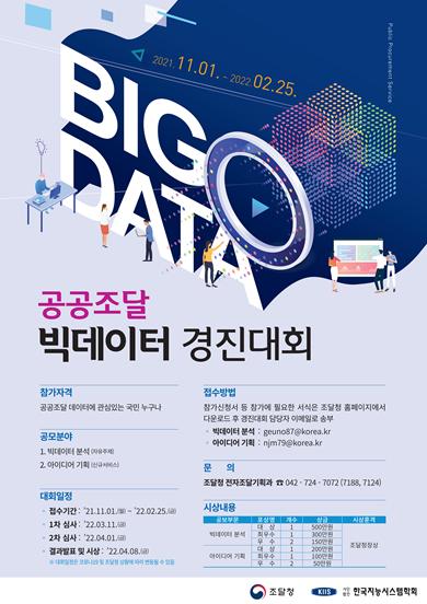 조달청은 공공조달 데이터에 대한 국민관심을 높이고, 정책적·산업적 활용 촉진을 위해 한국지능시스템학회와 공동으로 ‘공공조달 빅데이터 경진대회’를 개최한다.