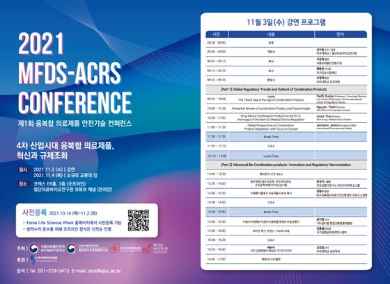 식품의약품안전처는 ‘4차 산업시대 융복합 의료제품, 혁신과 규제조화’를 주제로 ‘2021 제1회 융복합 의료제품 안전기술 콘퍼런스(2021 MFDS-ACRS Conference)’를 11월 3일부터 4일까지 코엑스(E5 홀)에서 개최한다.